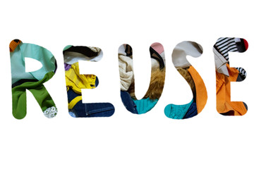 Word reuse written with transparsnt letters on the mixed updifferent clothes background. Isolated