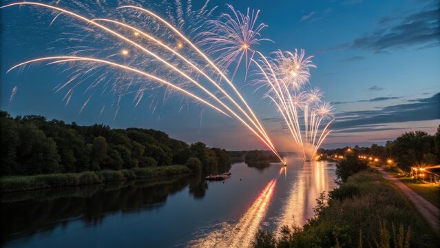 Streaks of Light Thin elongated fireworks shoot into the sky leaving trails of sparkling light in their wake. These streaks reverberate with brightness while the tranquil river