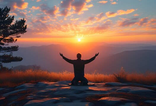 A man kneels in prayer, his head bowed and hands clasped, illuminated by a soft light in a dark, contemplative space.