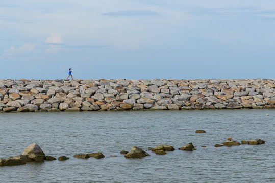 Granite revetment or seawall on the shore. Huge stones to protect beach from erosion. Prevent disaster. Copy space. Blue cloudy sky.