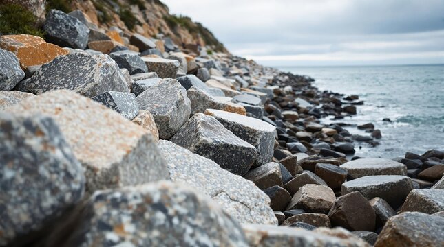 Coastal erosion barrier natural rock revetment with large boulders arranged to absorb wave energy along vulnerable shoreline during incoming tide with soft cloudy daylight