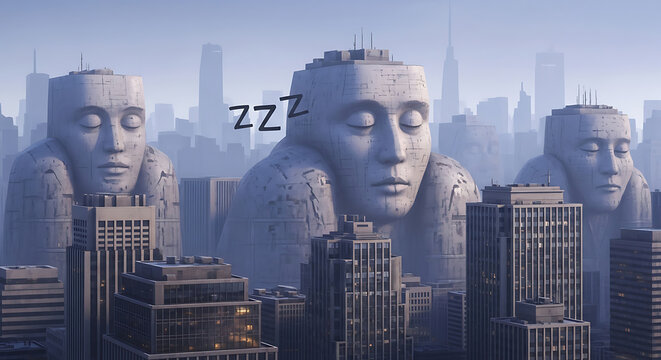 Colossal Stone Faces Slumbering Amidst a Misty Metropolis Skyline.