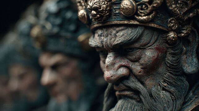 Mystical Warriors, Ancient Stone Faces with Ornate Headdresses, Timeless Sentinels