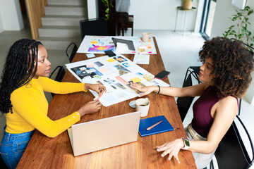 African American female coworkers reviewing design layouts at office table with laptop and coffee