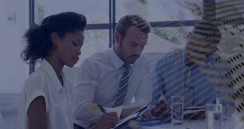 Team reviewing financial reports and taking notes in modern boardroom meeting