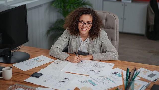 Smiling woman architect reviewing modern floor plans at desk in blazer and glasses