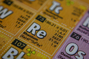 Rhenium. Transition metals. Chemical Element of Mendeleev's Periodic Table. Rhenium in square cube creative concept.