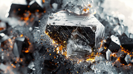Studio macro very close-up shot, product photography, rhenium precious metal rock. Isolated against background. Bright, studio lighting. Very modern, contemporary, current style