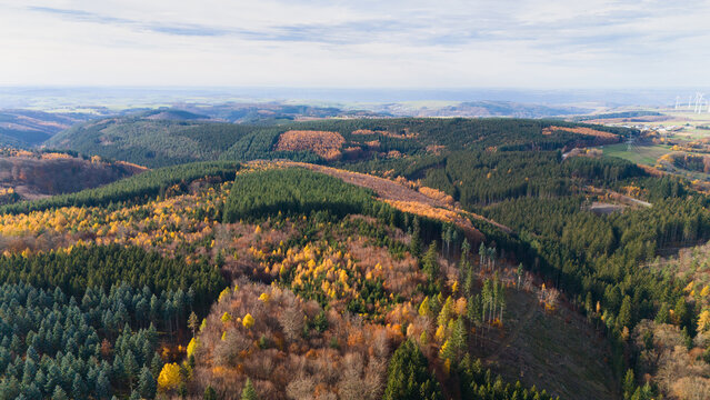 Autumnal deciduous and coniferous forest landscape, autumn colored tree leaf, nature in Rhineland Palatinate, Germany, ecosystem woodland, environment, aerial view
