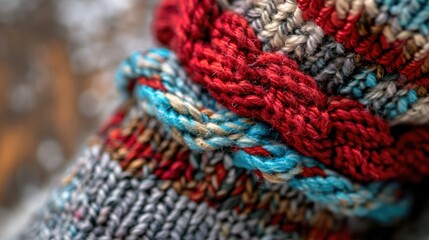 Blue grey white wool knitted sweater on the metal needles with yarn balls and vintage scissors, stockinette stitch knitting in progress close-up photo