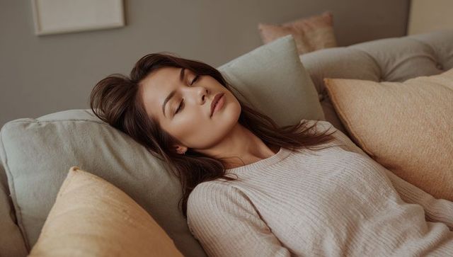 Serene young woman reclining on neutral sofa surrounded by soft pillows for cozy rest