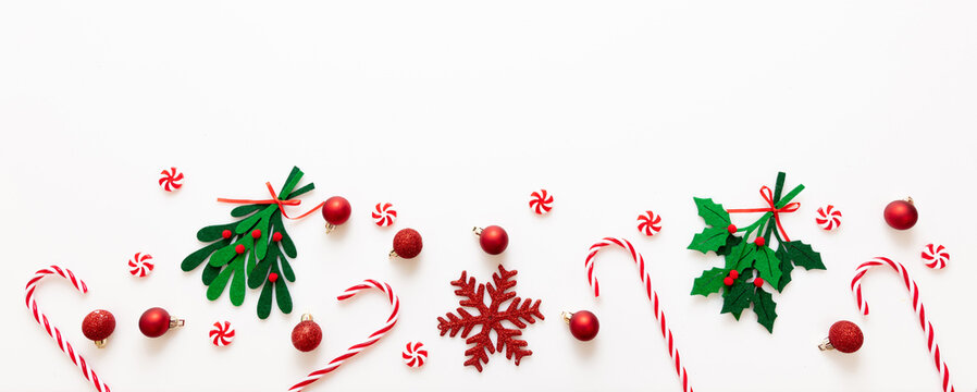 Christmas decoration border isolated on white background. Red balls and candy canes banner