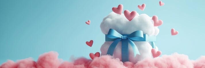 Iridescent ribbon bow in pastel sky with sparkling spheres