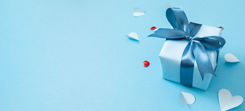 Festive composition with a blue gift and hearts on a pastel blue background.