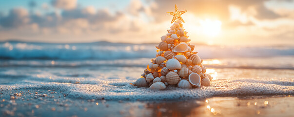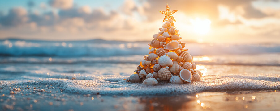 A gingerbread cookie shaped like a Christmas tree stands on the sea shore. Next to it is a starfish and two seashells, with a warm sunset in the background