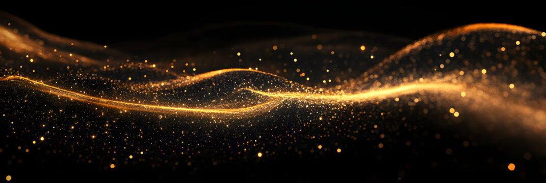 Golden silk ribbon floating with glowing particles on black background – luxurious abstract elegance