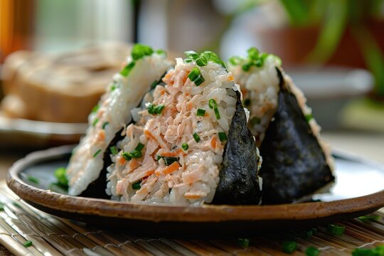 Onigiri is a Japanese rice ball wrapped in seaweed, often filled