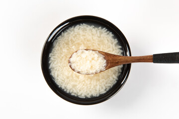 Bowls of rice and aromatic spices featuring turmeric and cinnamon sticks