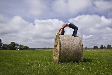 Young woman sitting on hay rick in summer