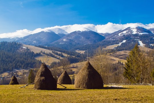 haystacks on hill slope, farming field in highland area of Carpathian Mountains, white clouds on top, early spring morning, extreme tourism concept, nature protection and ecology background