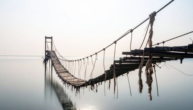 An old rickety suspension bridge made of wood and rope spans over water in a foggy misty environment