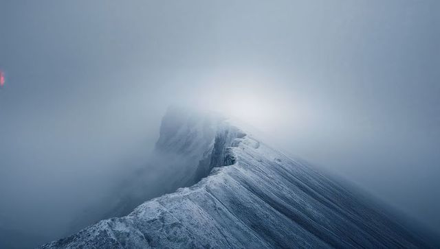 Snowy ridge slicing through dense alpine fog toward wind-scoured summit