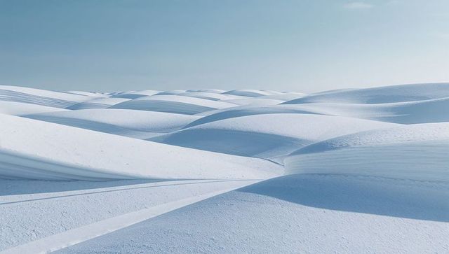 Sweeping groomed ridges curving across frozen plain with parallel tracks, blue horizon