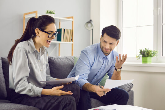 You kidding me. Nonsense. Bewildered puzzled couple sitting on sofa and laughing reading funny paper document, absurd agreement, hilarious notification letter, ridiculous contract terms and conditions