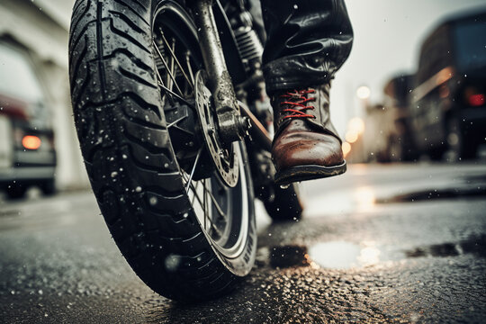 Generative AI close up picture of male legs in leather stylish footwear riding on a moped in the evening city