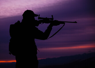 Soldier in camouflage aiming rifle in tall grass