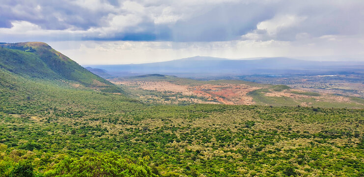 Magnificent panorama view of the Great African Rift Valley with Mount Suswa in the background with rain clouds as seen from the edge of the escarpment near Nairobi, Kenya,Africa