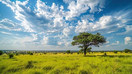 A vast, open savanna teeming with wildlife, under the vast expanse of an African sky