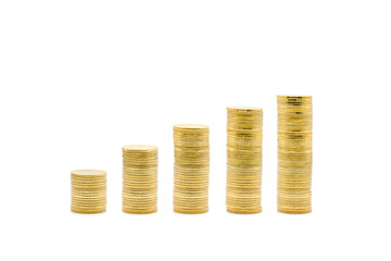 The minimal Gold coins towers graph pattern that shows the growth of investment and saving money from left to right are isolated on white background. Clipping Paths.