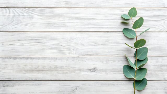 Rustic white wash wood board flat mockup background with eucalyptus branch flat lay to the right side