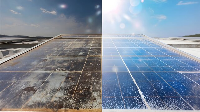 split screen horizontal comparison of a single solar panel on a factory rooftop left side dirty with dust leaves and stains right side clean and shiny with su.