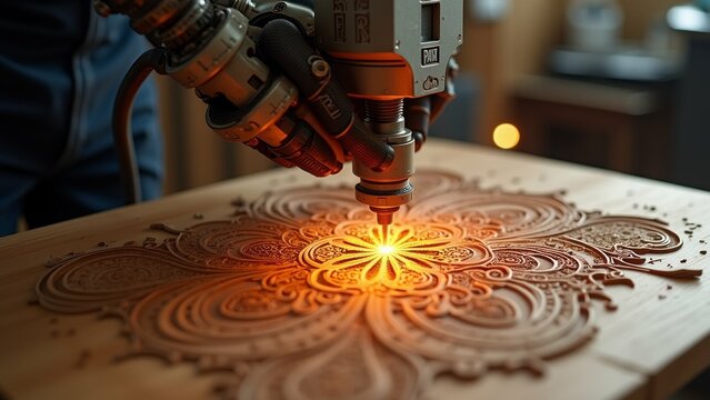 close cnc computer numerical control machine cutting wooden surface laser cutter machine orange color has control panel right side laser cutter center emitting bright orange light illuminates