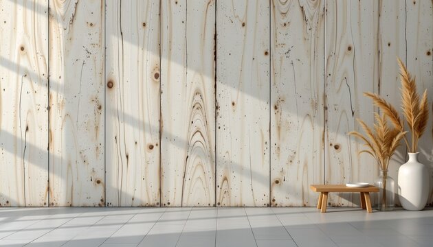 an interior space with a large wooden panel wall on the right side. these panels are distressed with a rustic appearance, revealing underlying textures