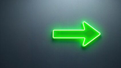 Green neon arrow-shaped pointer on wall, directional guidance in urban settings