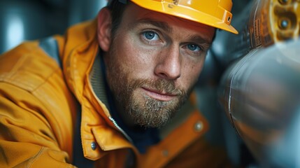A focused engineer in reflective safety wear and hard hat inspecting machinery in an industrial setting