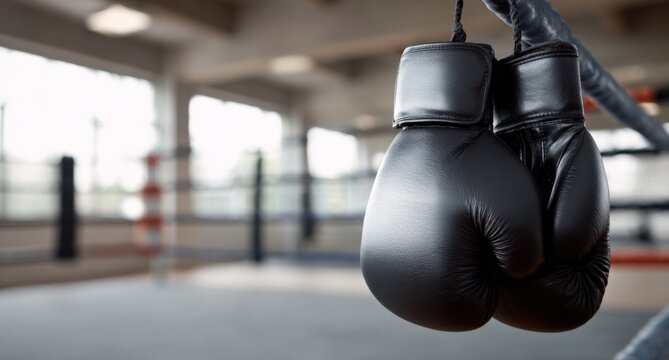 Black leather boxing gloves hanging in empty gym boxing ring