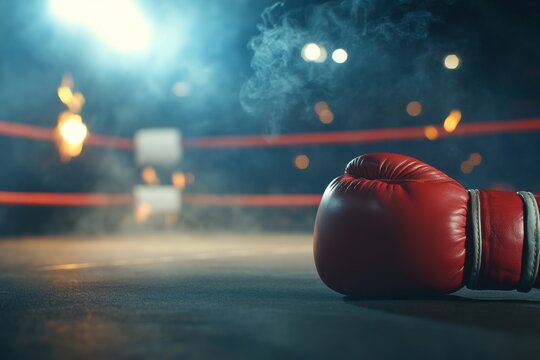 A pair of red boxing gloves are positioned on the edge of a boxing ring, with faint outlines of ropes and an arena ambiance visible in the background