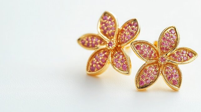 A floral-inspired pair of gold earrings with petal outlines encrusted with pink sapphires