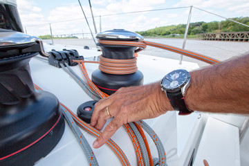 A man using the winch system on a luxurious catamaran cruising on the Garonne river