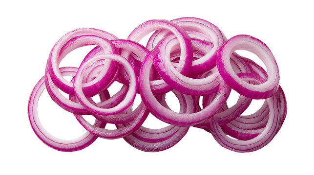 Fresh, sliced red onion rings, vibrant and ready for culinary use, isolated on a white background.