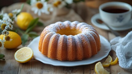 The lemon tart is decorated with a delicate lattice pattern. Surround with a ring of bright yellow lemon slices and sprinkle with powdered sugar.