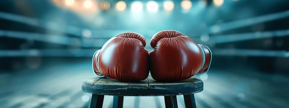 Primo piano di un paio di guanti in pelle marrone da boxe su un piccolo sgabello in un ring di boxe