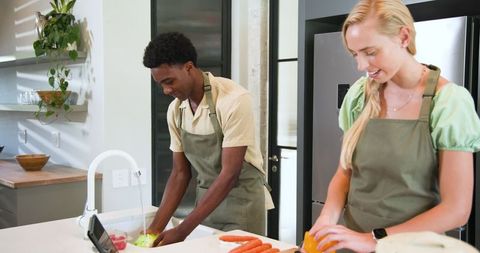 Modern couple cooking together at home kitchen island