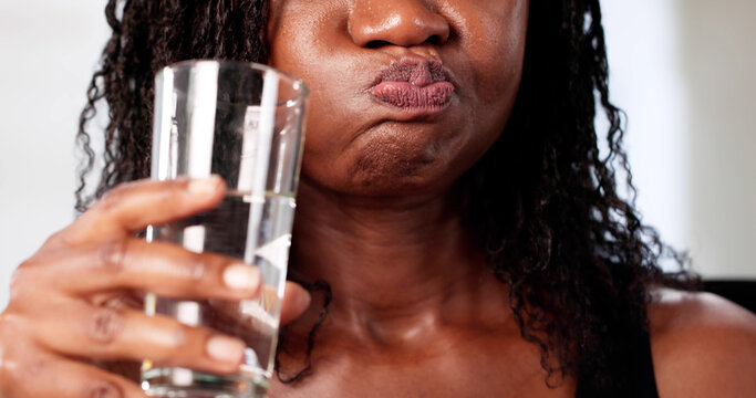 Man, oral hygiene and cleaning mouth by sink in bathroom for morning routine, brushing teeth or fresh breath. Dental care, african person or rinsing in home for personal health, grooming or wellness