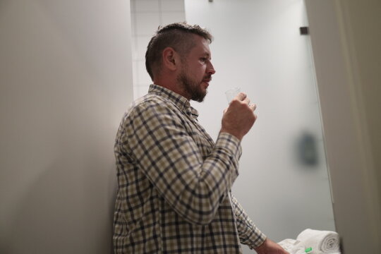 Your smile is worth it. Man rinsing mouth in bathroom. Teeth care. Copy space on the right side
