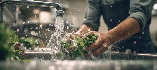 Kitchen Worker Rinsing Fresh Greens Under Running Water in Clean Sink
